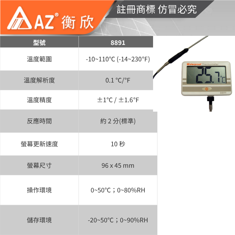 AZ衡欣實業8891超省電高精度防水溫度計🔘50公分長溫度測棒🔘IP67防水等級可清水沖洗