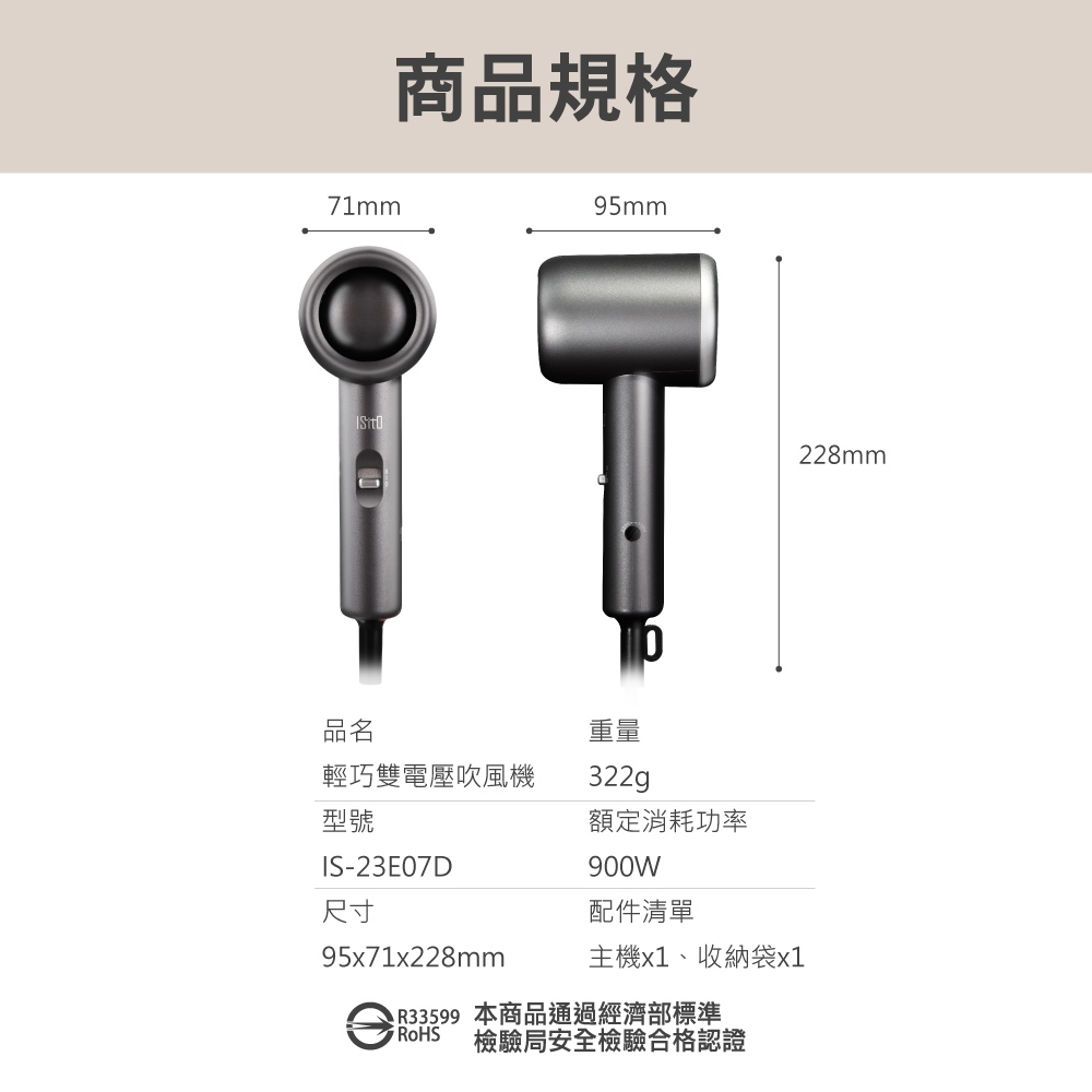 【ISITO 輕巧雙電壓吹風機 IS-23E07D】旅行吹風機 便攜吹風機 吹風筒 家用吹風機 出國用