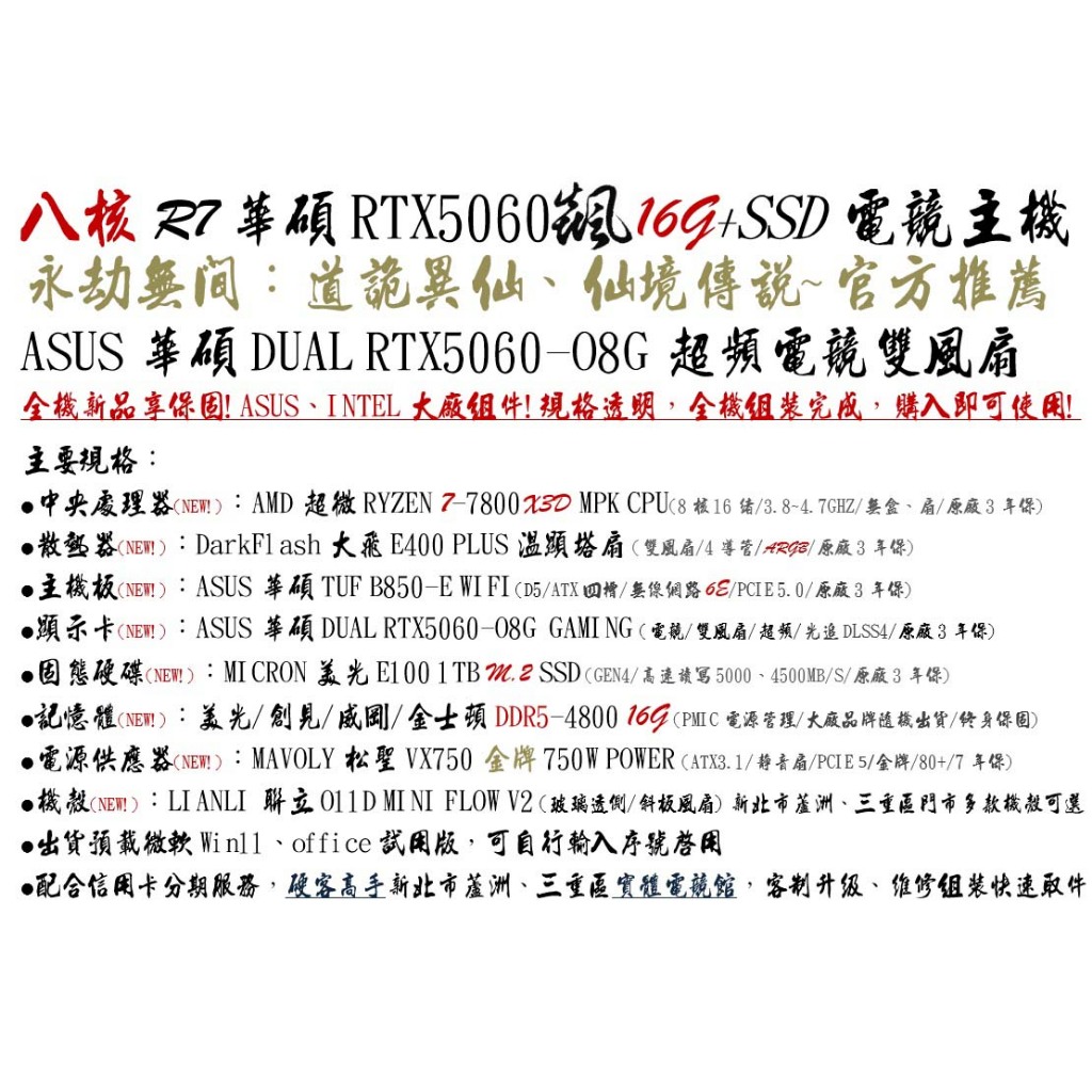 永劫無間】八核 R7 7800X3D 華碩 B850 WIFI超頻雙扇 RTX5060 飇16G 金牌 電競 電腦 主機