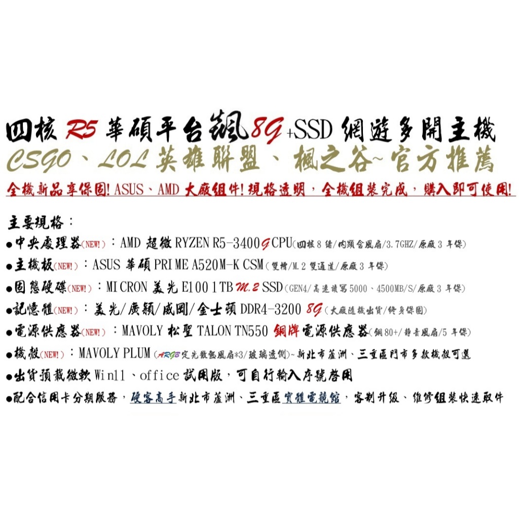 CSGO】全新 四核 R5 華碩 平台 1TB SSD 飇 8G 銅550W 電腦 主機 AMD 內顯【高效文書 多開