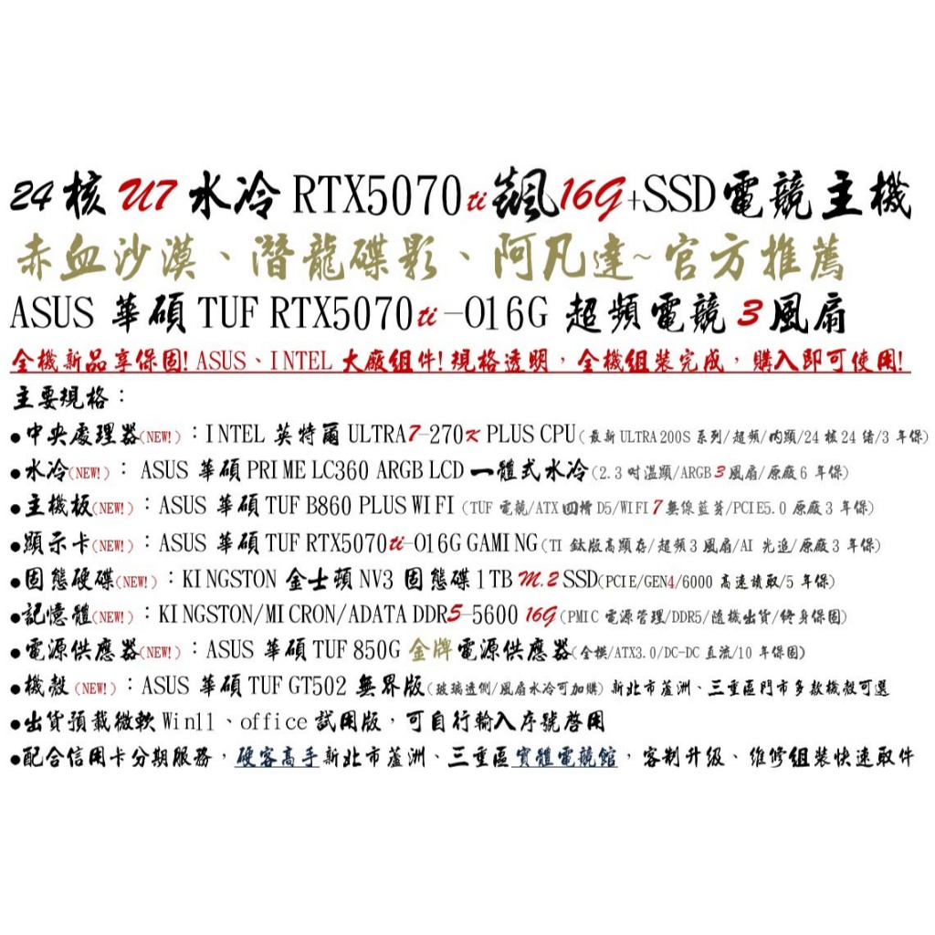 赤血沙漠】24核 Ultra 7 水冷 華碩 WIFI 7 超頻3扇 RTX5070TI 飇16G 金牌 1T電競 主機