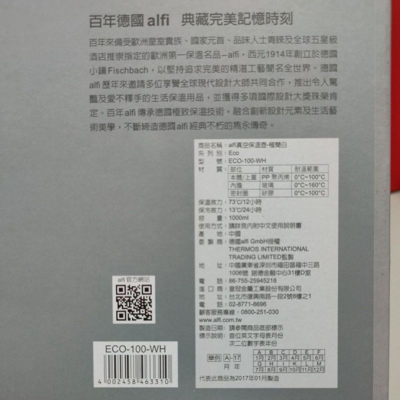 ALFI 膳魔師 ECO-100 玻璃內膽真空保溫壺 保溫瓶 1000ml (蝦皮、超取限2支)