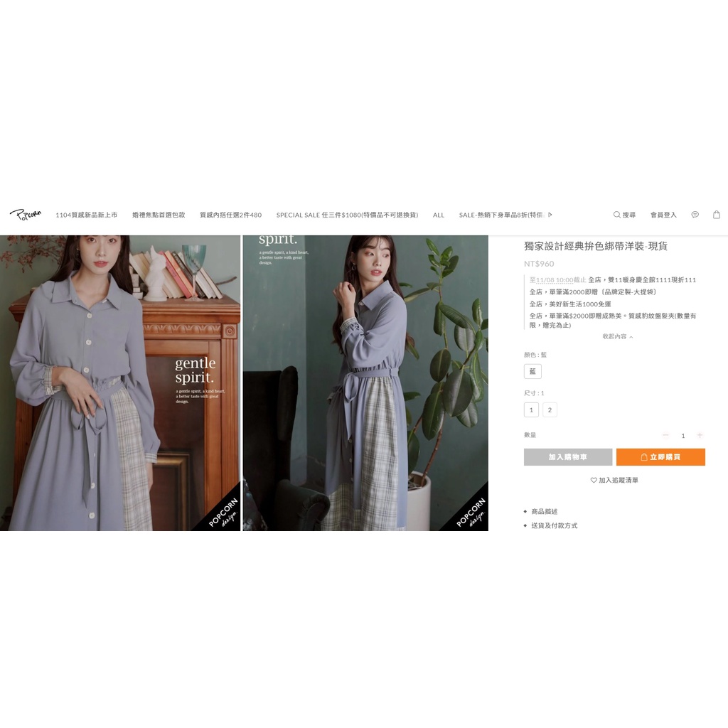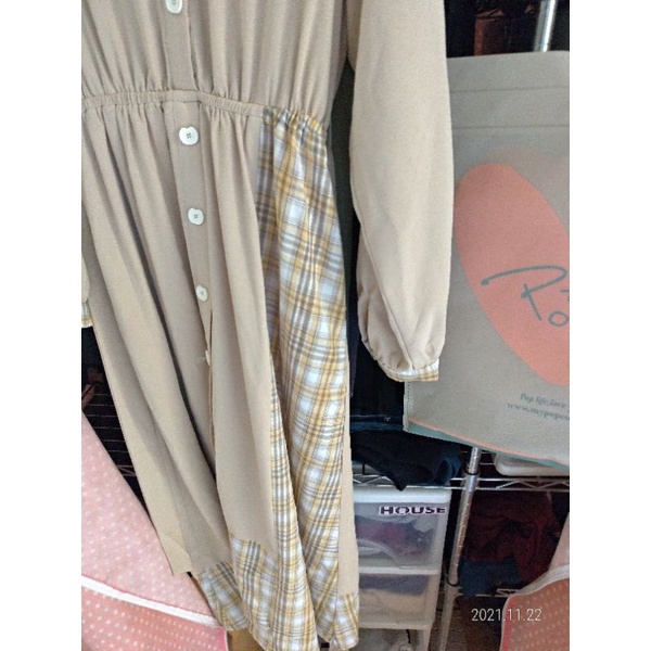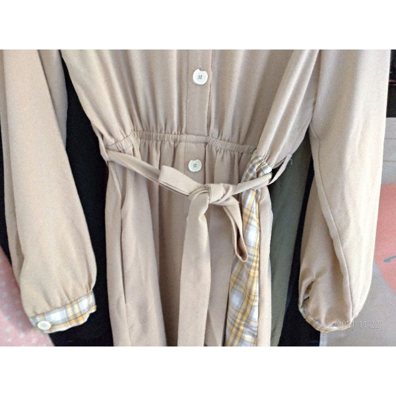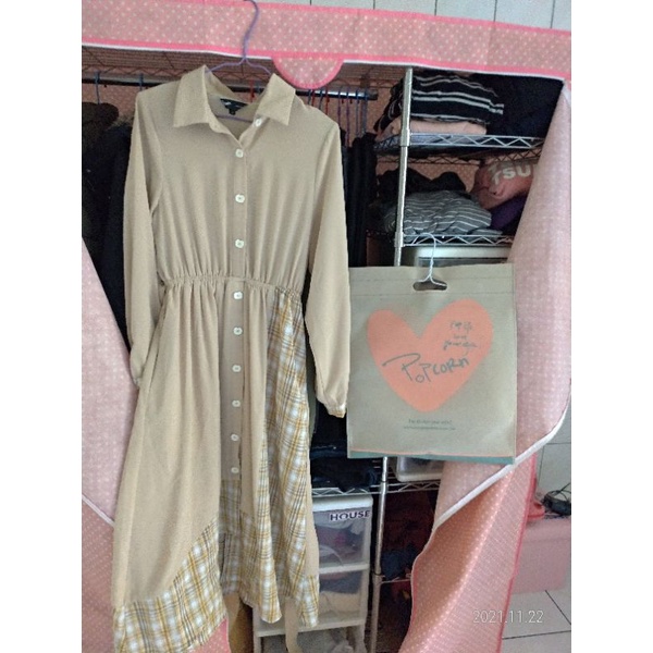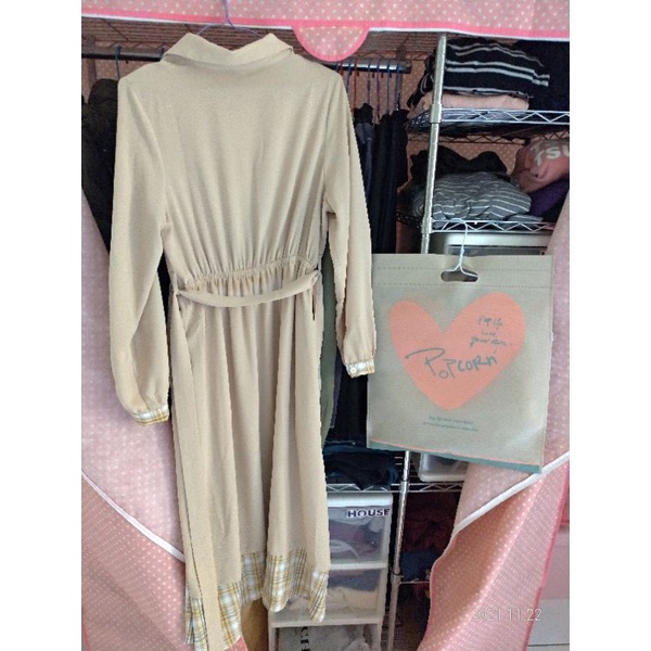 Popcorn,爆米花服飾,獨家設計,經典,拚色綁帶,女生,秋季洋裝,長洋裝,卡其色,2號,贈品:獨家手提袋,高雄可面交