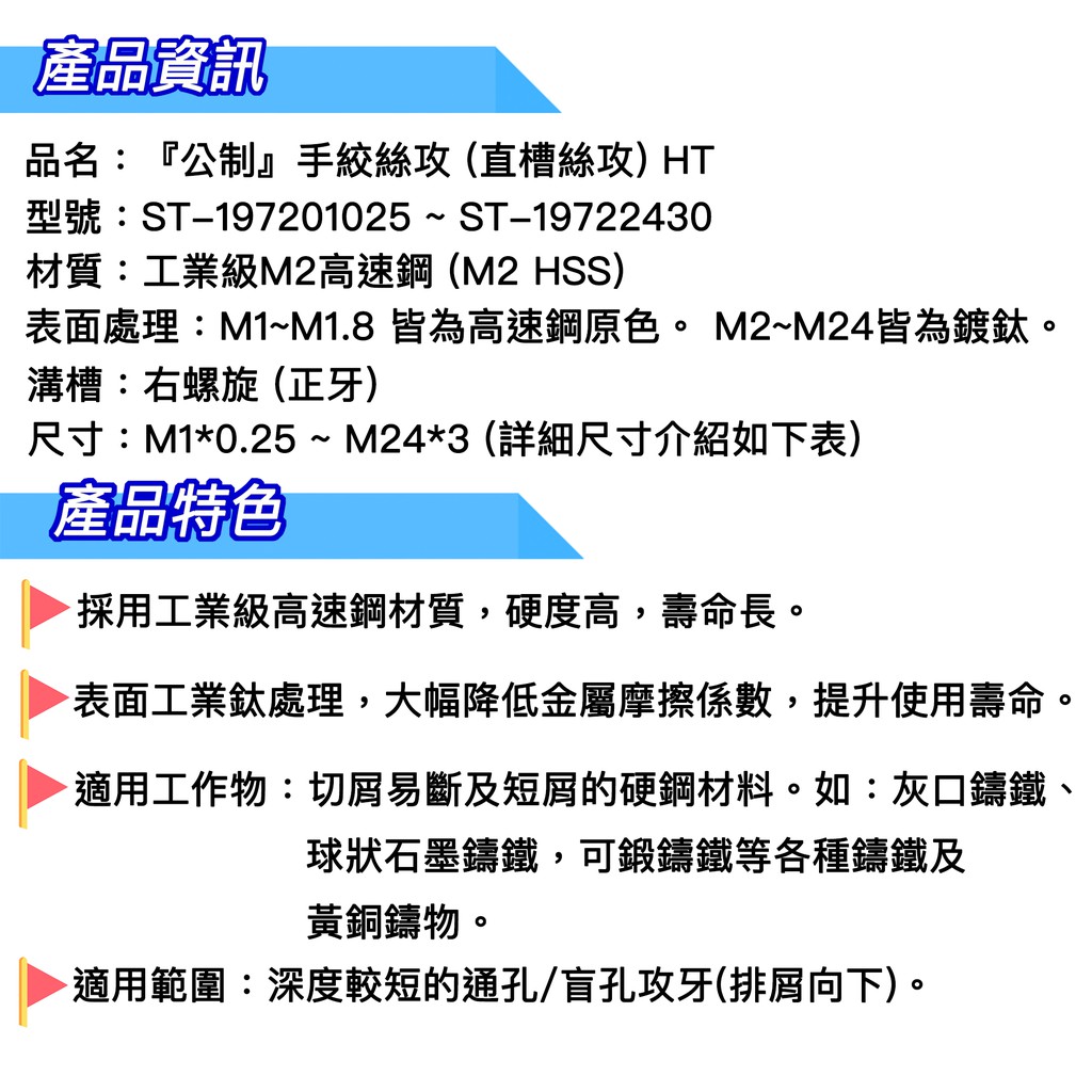 【STANBAL史丹堡】手絞絲攻(直槽絲攻)HT 通孔用 M1~M16