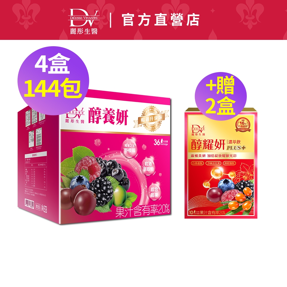 DV麗彤【精選品牌】野櫻莓版醇養妍(36包)x4盒+送醇耀妍(10包)x2盒<滿額送術後洗卸凝膠>白藜蘆醇/蔓越莓
