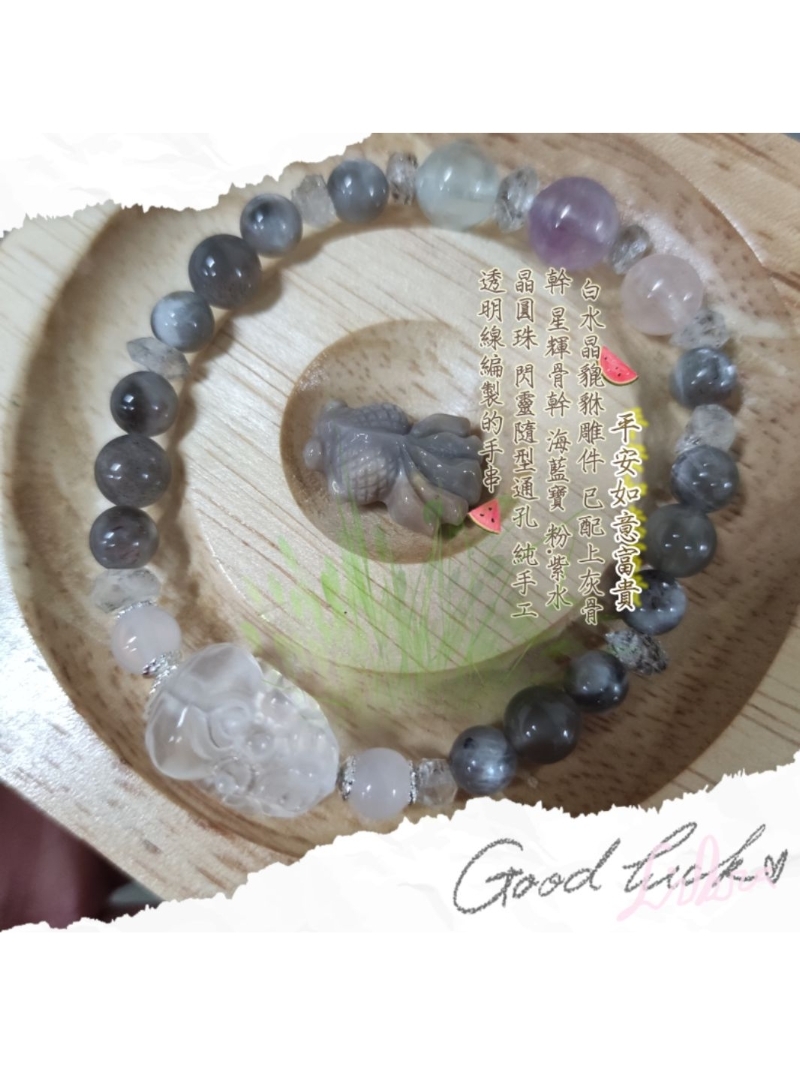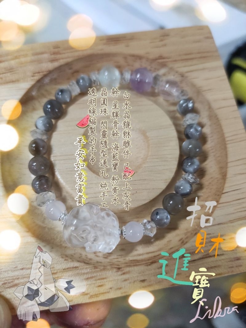 🐯白水晶貔貅雕件🐅 🌿已配上白瑪瑙 灰骨幹 星輝骨幹 海藍寶 粉 .紫水晶圓珠 閃靈鑽隨型通孔 純手工透明線編製的手串📿