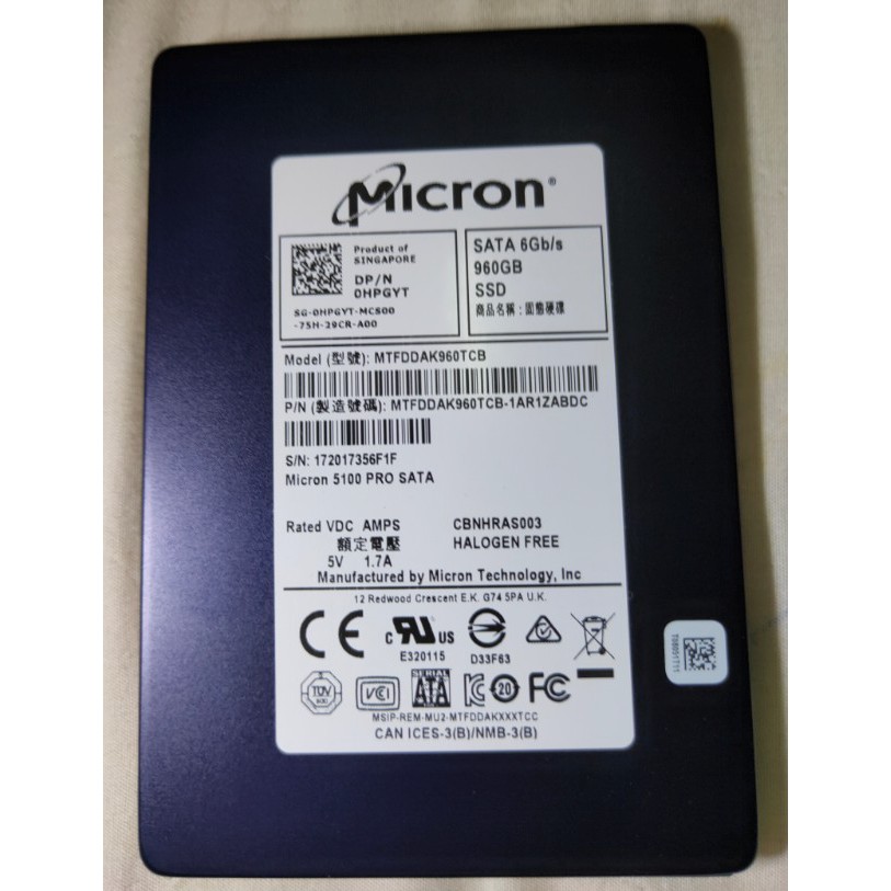 美光5100Pro 960GB/SATA/SSD/Dell(微量寫入)