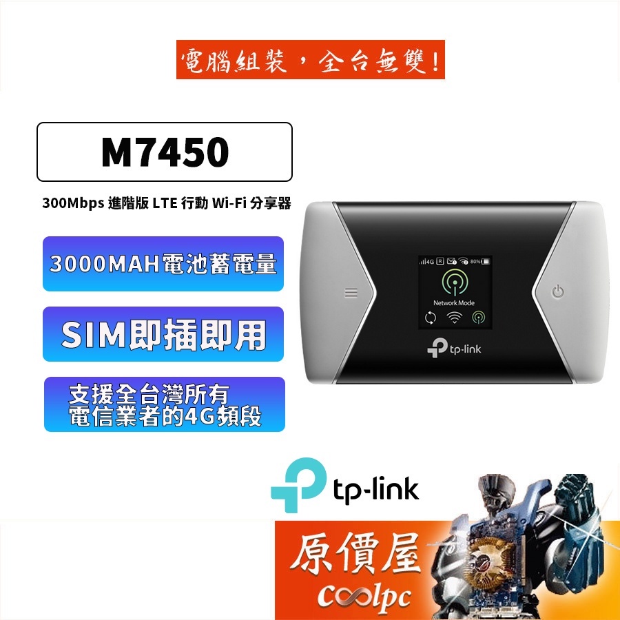 TP-LINK M7450【300M】/3000mAh電池/三年保/4G LTE行動Wi-Fi分享器/SIM卡/原價屋