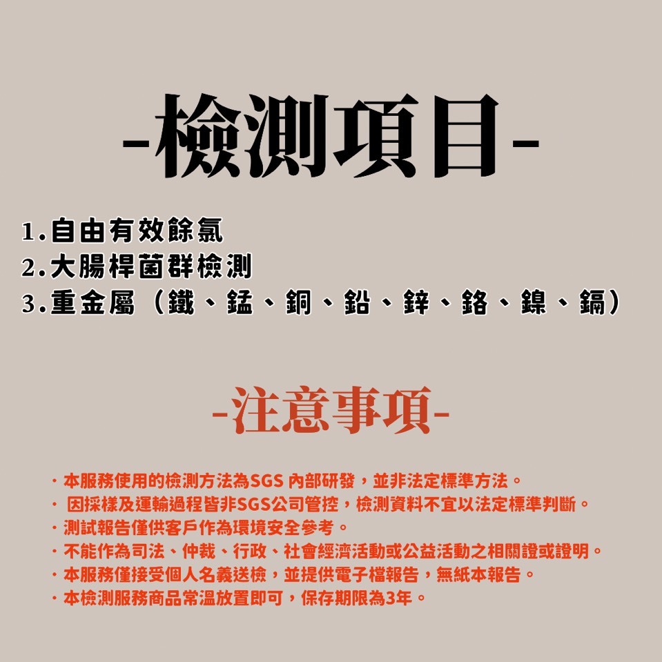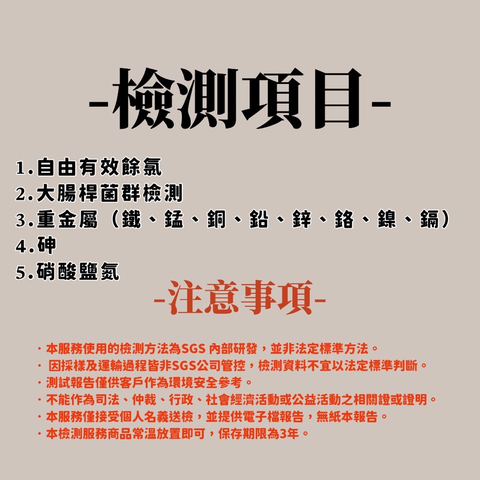 【單件賣場】𝗦𝗚𝗦▕ 飲用水▕ 水質檢測|大腸桿菌群🔹餘氯🔹重金屬🔹砷🔹硝酸鹽氮|⑩ 個工作天檢測報告(個人名義)