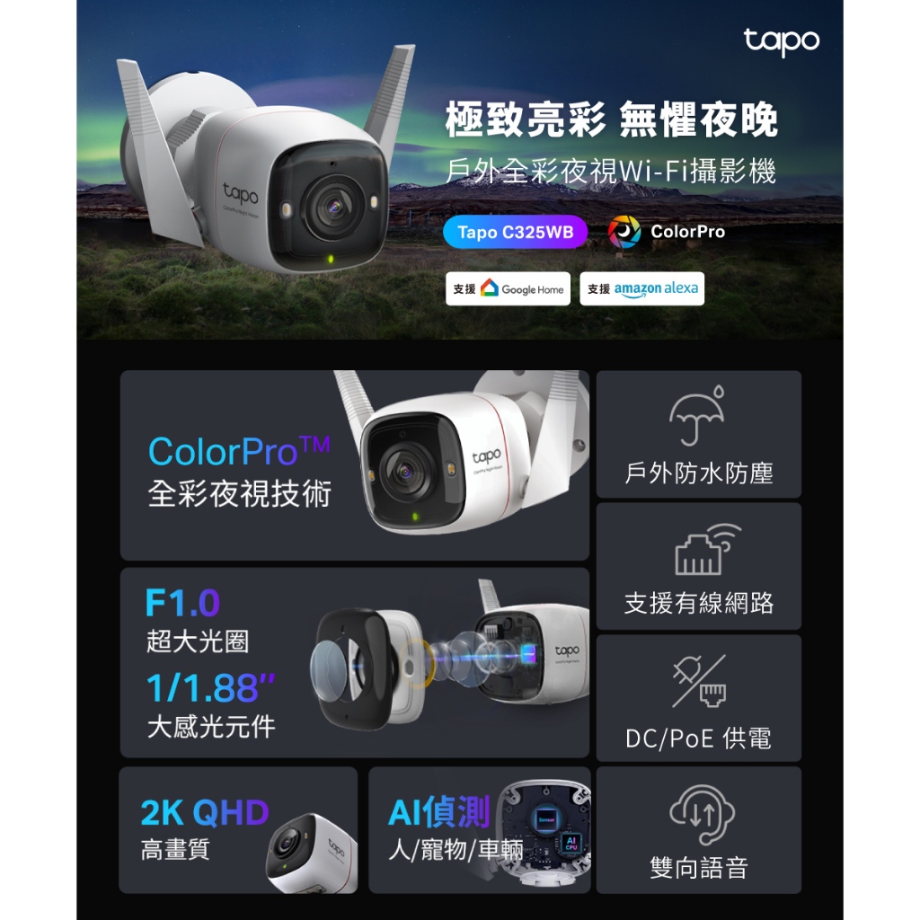 TP-Link Tapo C325WB 400萬畫素 2KQHD Wi-Fi監視器 AI偵測 ColorPro夜間顯示器