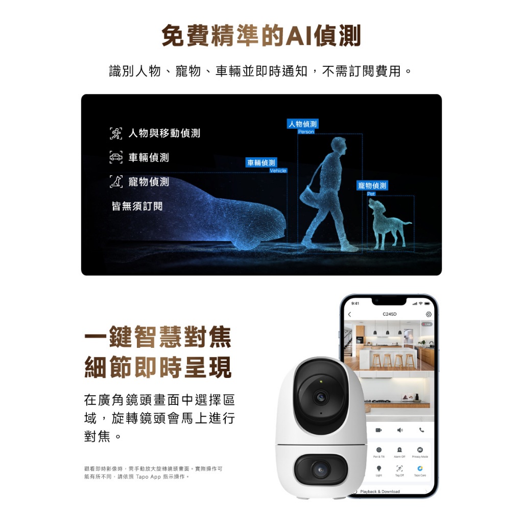 TP-Link Tapo C245D 雙2K 300萬 Wi-Fi監視器 智慧雙AI偵測 彩色夜視 雙向語音 固定+旋轉