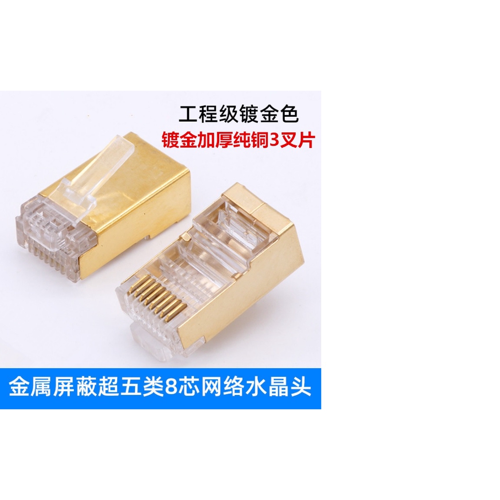 RJ45 銅殼30U三叉鍍金超五類遮罩水晶頭8P8C Cat.5E銅片抗干擾網路線接頭 網路水晶頭