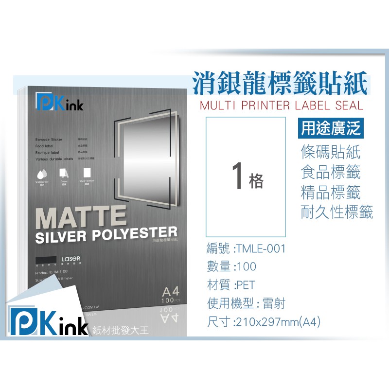 PKink樂昇科技-消銀龍標籤紙 / A4 / 無切格 / 100張入 已含稅