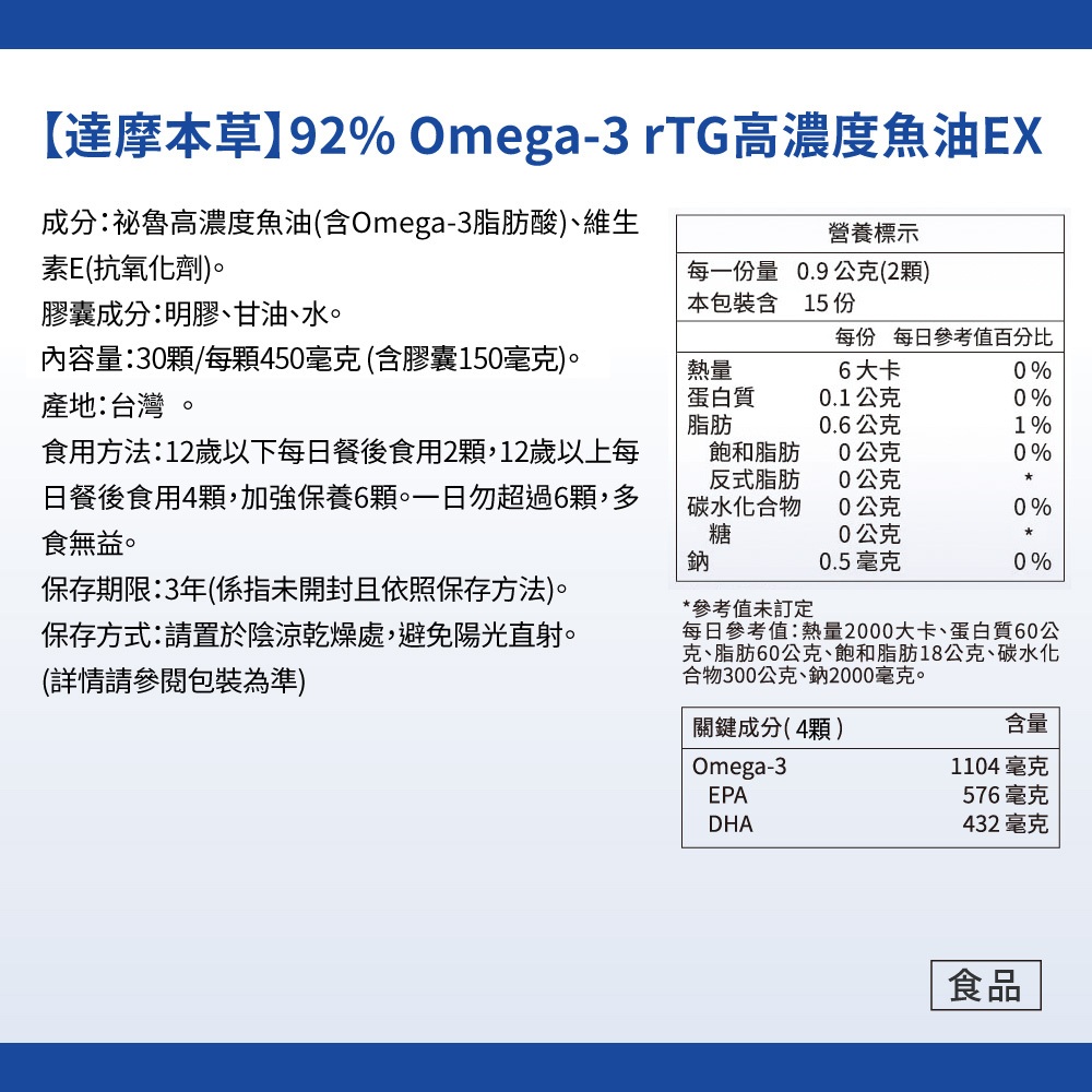 【達摩本草】92% Omega-3 rTG高濃度魚油EX x1盒(30顆/盒)