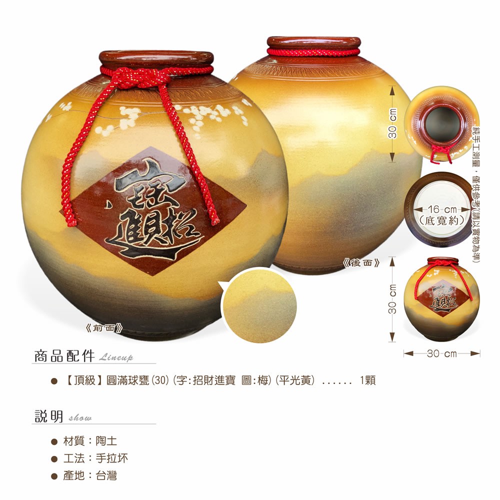 【唐楓藝品圓滿球甕】平光黃圓滿球甕(30cm)(字:招財進寶 圖:梅)