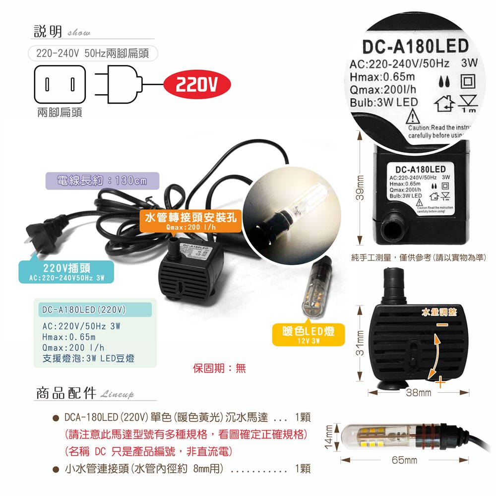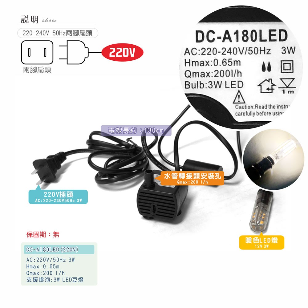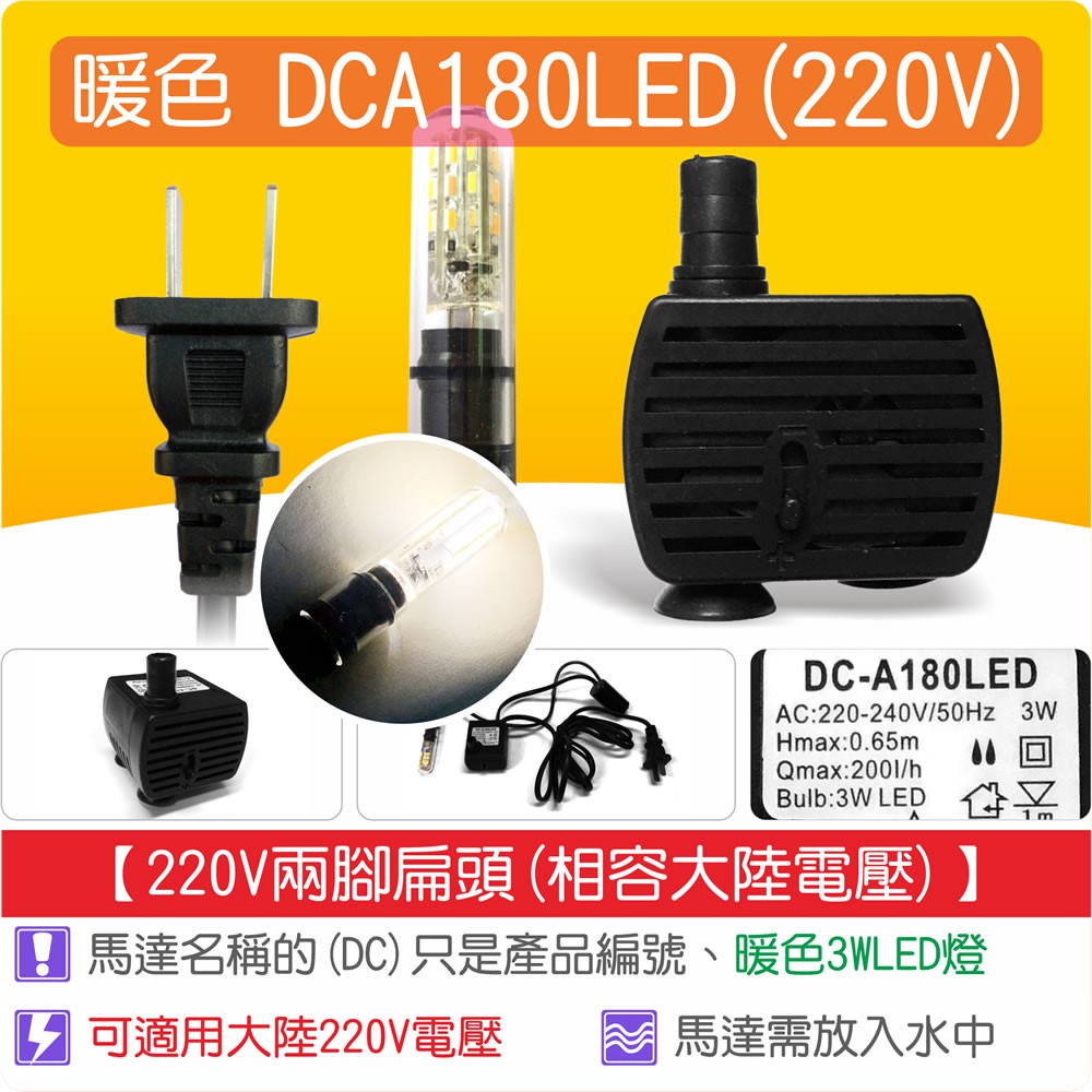 【唐楓藝品耗材零件】LED 沉水馬達 DCA180 LED(3W LED)(220V兩腳扁頭)