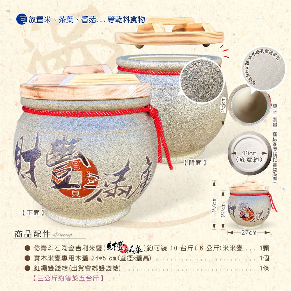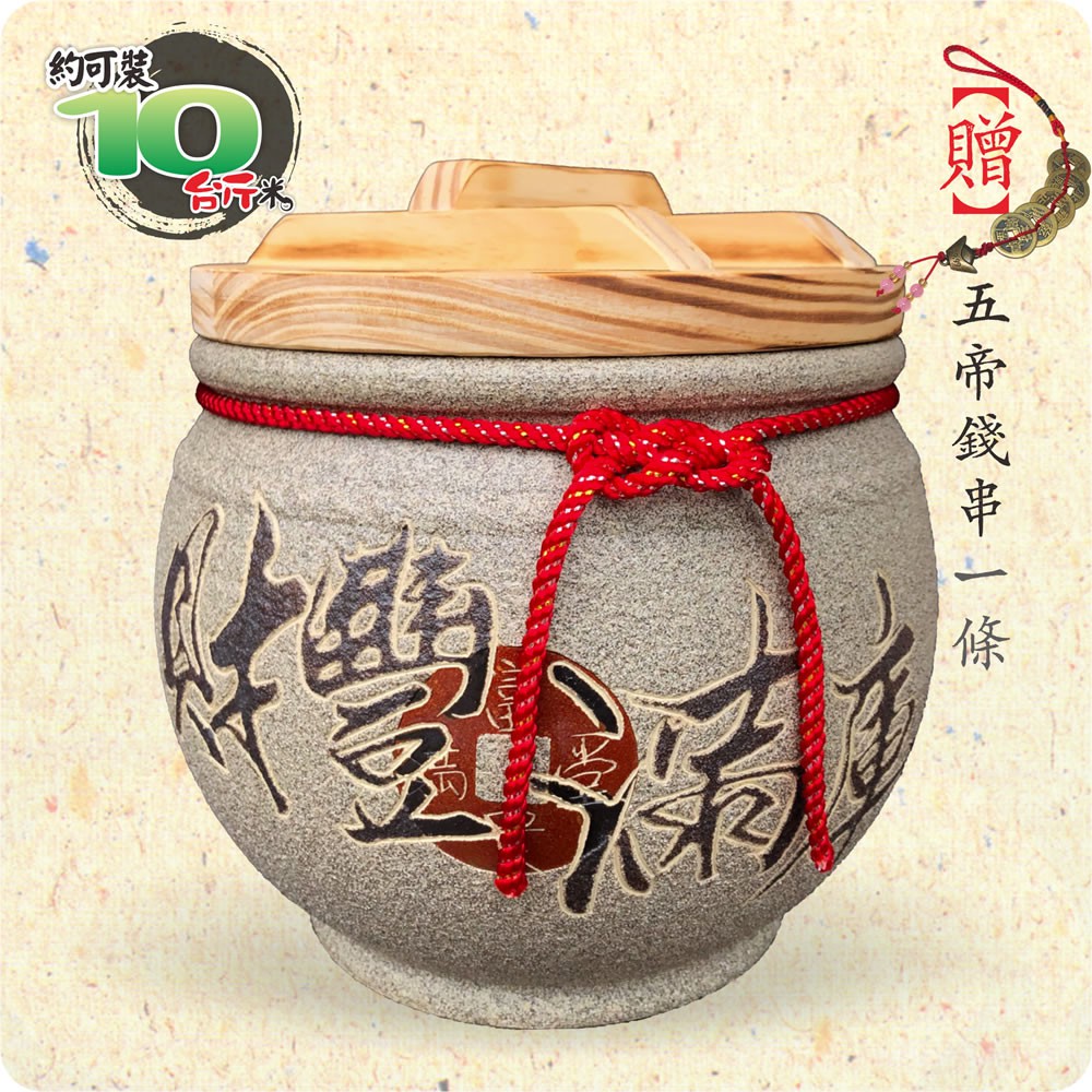 【唐楓藝品米甕】青斗砂釉灰(財豐滿庫)米甕 | 約裝 10 台斤米