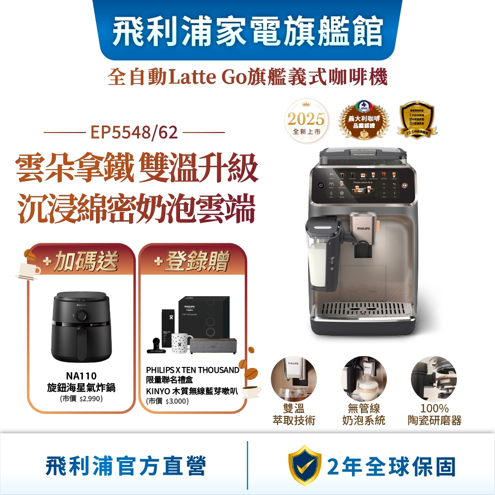 【PHILIPS 飛利浦】LatteGo全自動義式咖啡機(EP5548/62)+氣炸鍋NA110 | 精品咖啡