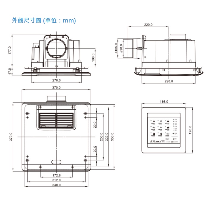 阿拉斯加 300BKP 標準型 單段風速 線控 浴室暖風機 乾燥機
