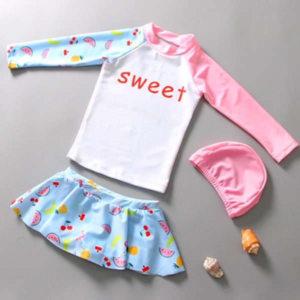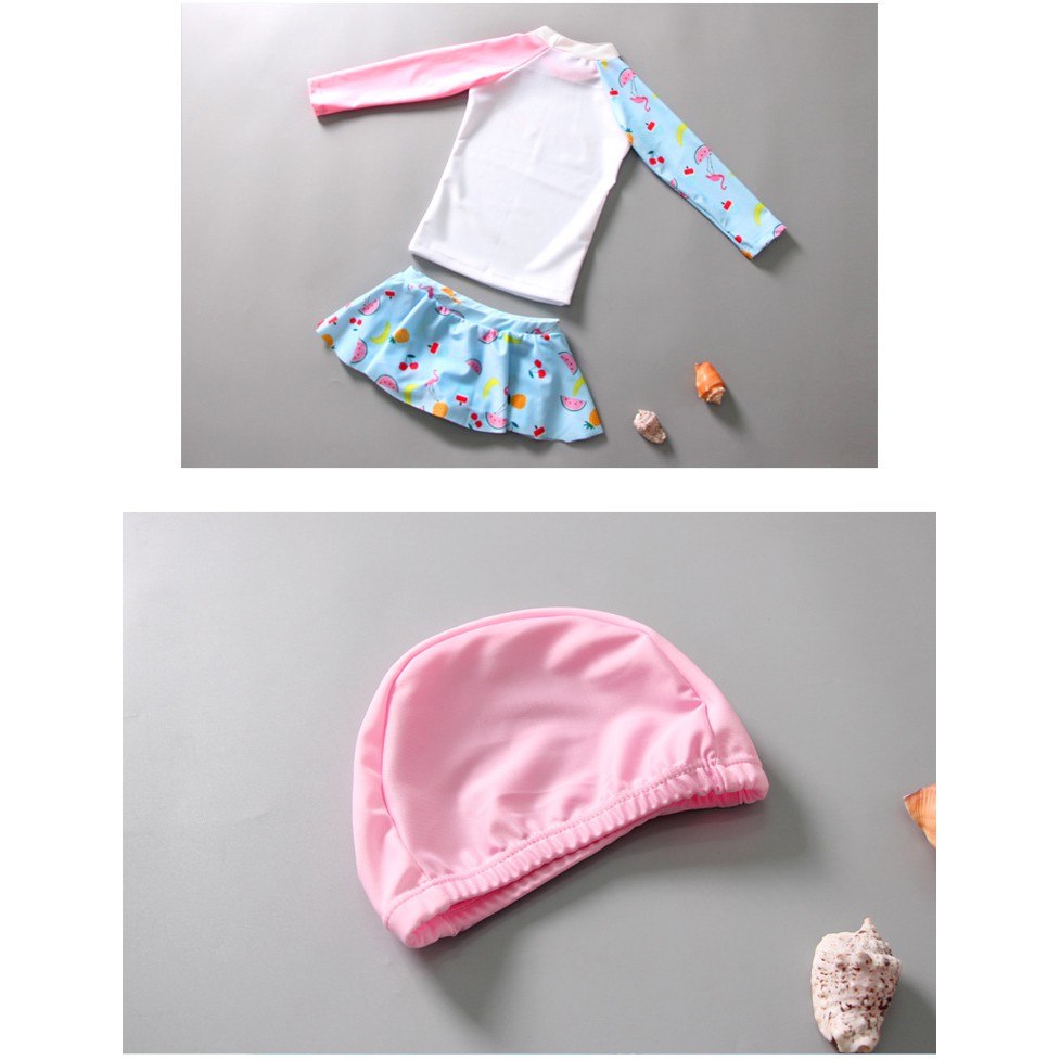 消暑西瓜紅鶴長袖泳裝+泳褲褲裙+泳帽 3件式 水母衣 女童 防曬 長袖 泳衣 橘魔法 現貨【BB9754】