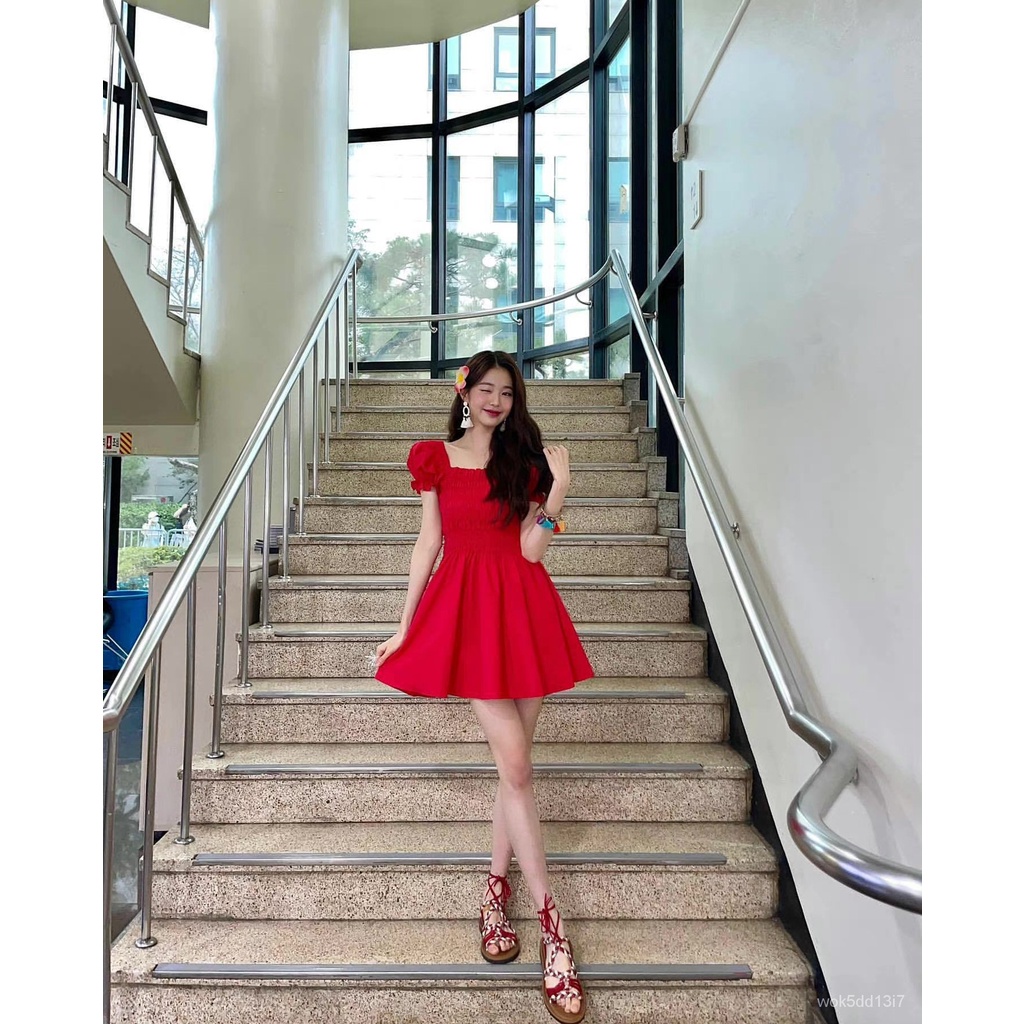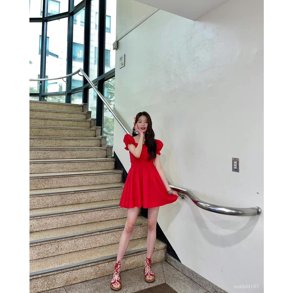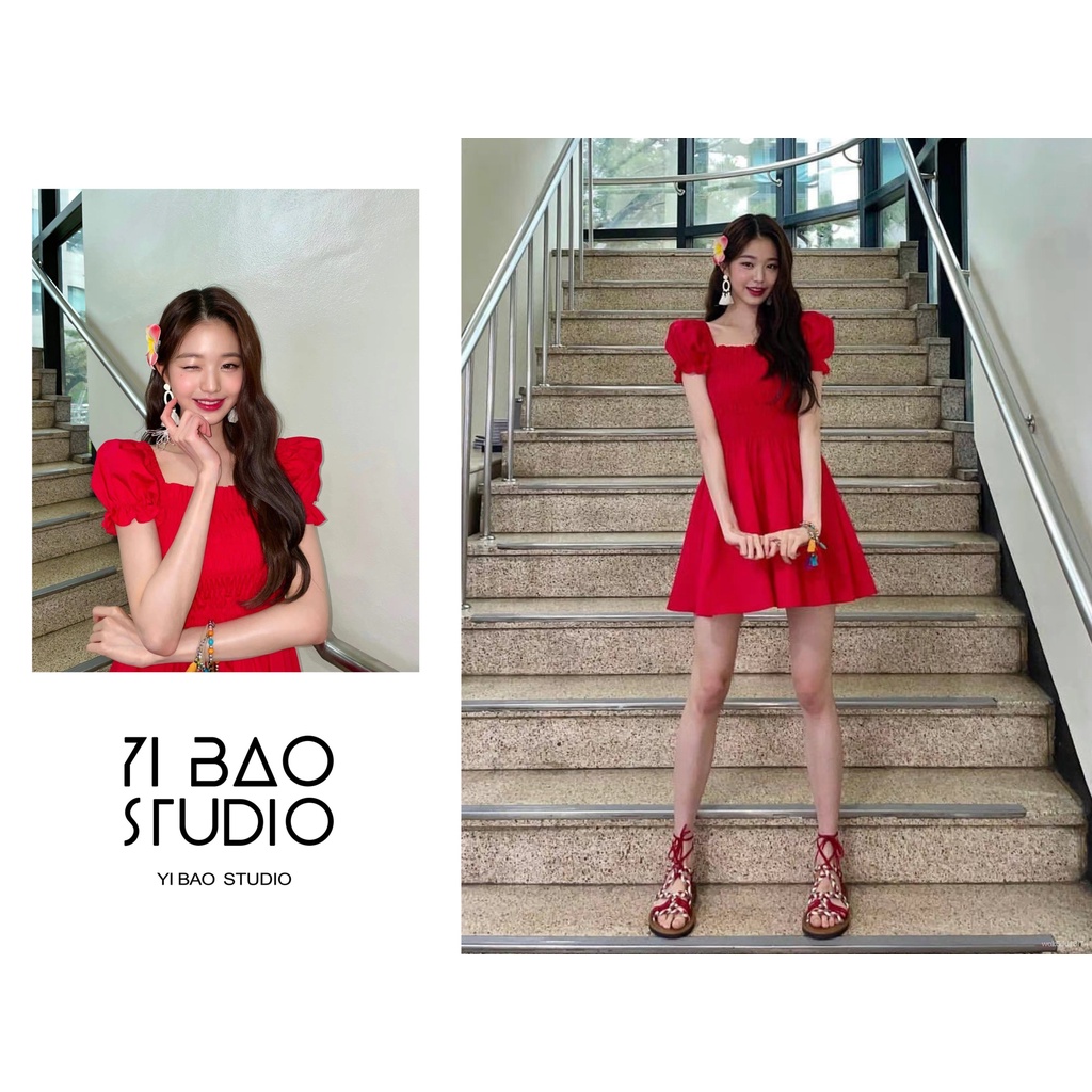 IVE張元英衕款紅色方領泡泡袖連衣裙褶皺收腰顯瘦短裙2022新款 女生衣著 明星衕款 辣妹穿搭NANA Studio💕