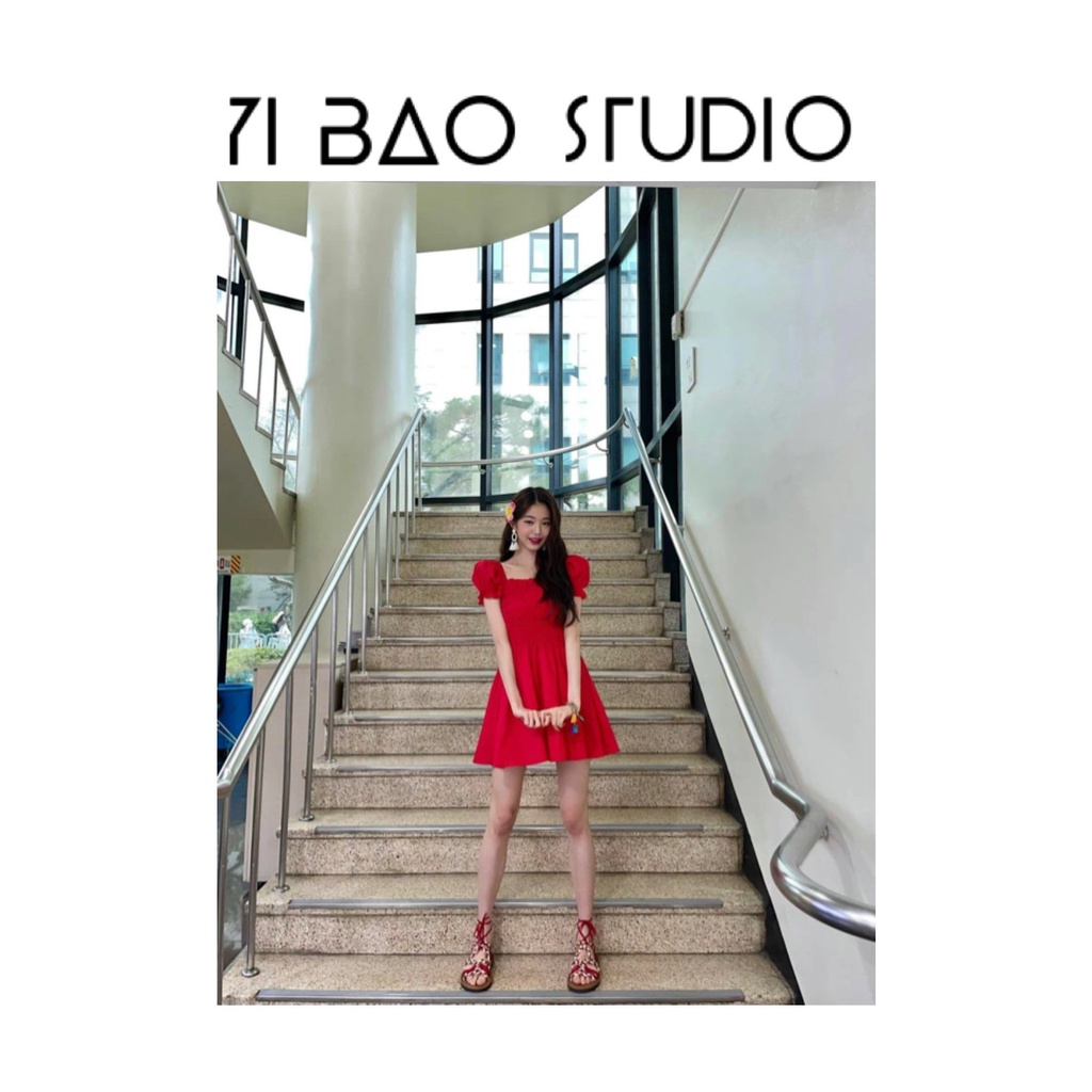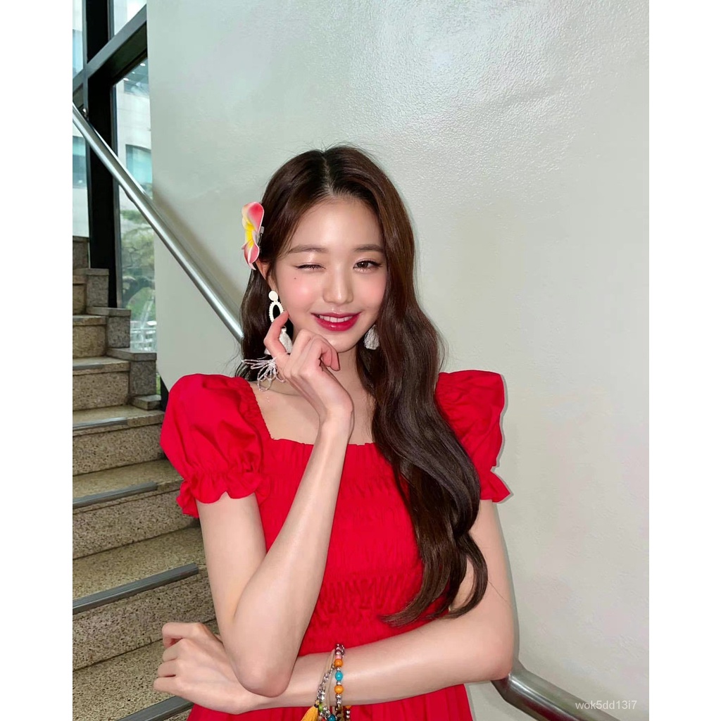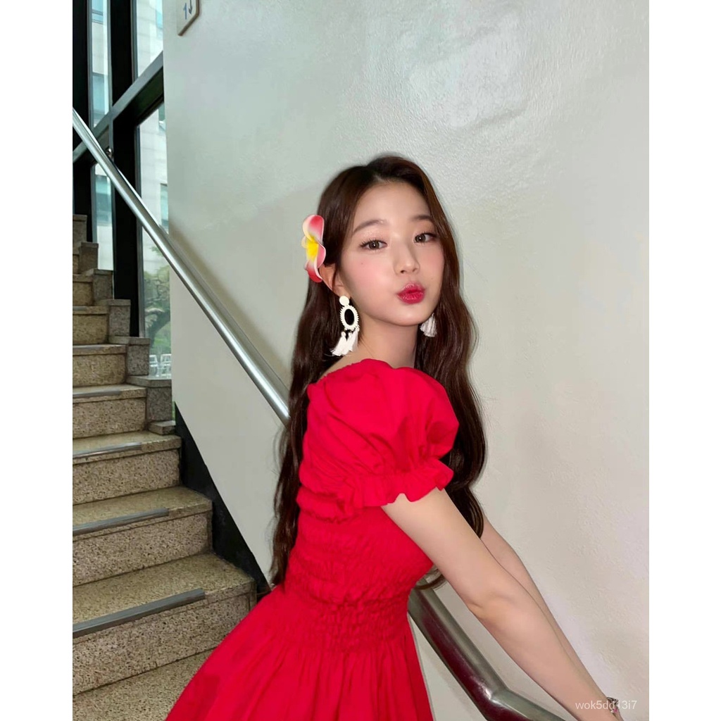 IVE張元英衕款紅色方領泡泡袖連衣裙褶皺收腰顯瘦短裙2022新款 女生衣著 明星衕款 辣妹穿搭NANA Studio💕