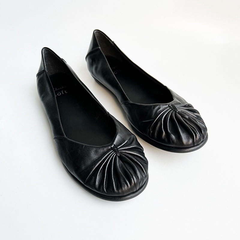 美國百分百【全新真品】Clarks 娃娃鞋 女鞋 平底鞋 圓頭 黑色 蝴蝶結 皮革 黑色 US9.5 AU06