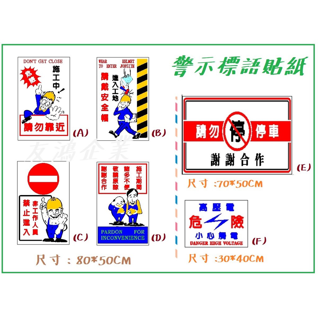 大尺寸背膠貼紙 工地安全標語 警示標語 自黏式貼紙 施工中請勿靠近 請勿停車 進入工地請戴安全帽 非工作人員禁止進入