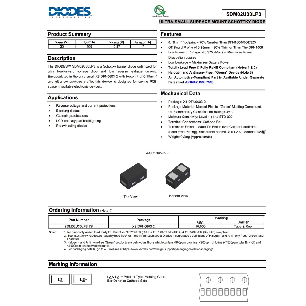 SDM02U30LP3-7B DIODES 二極體 肖特基 30 V 100mA X3-DFN0603-2