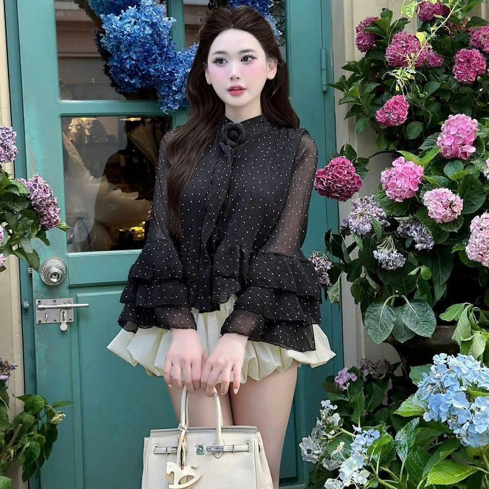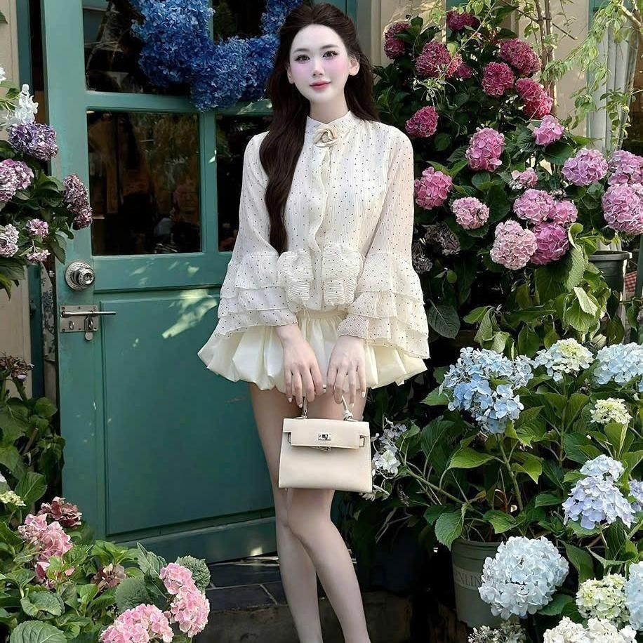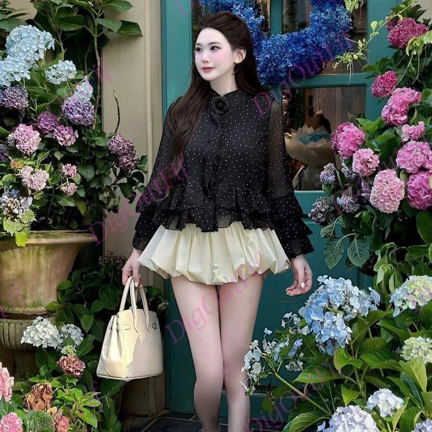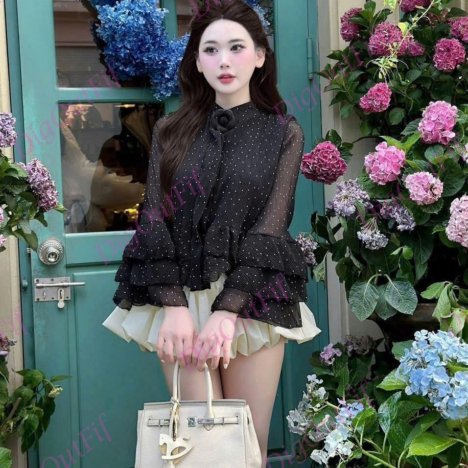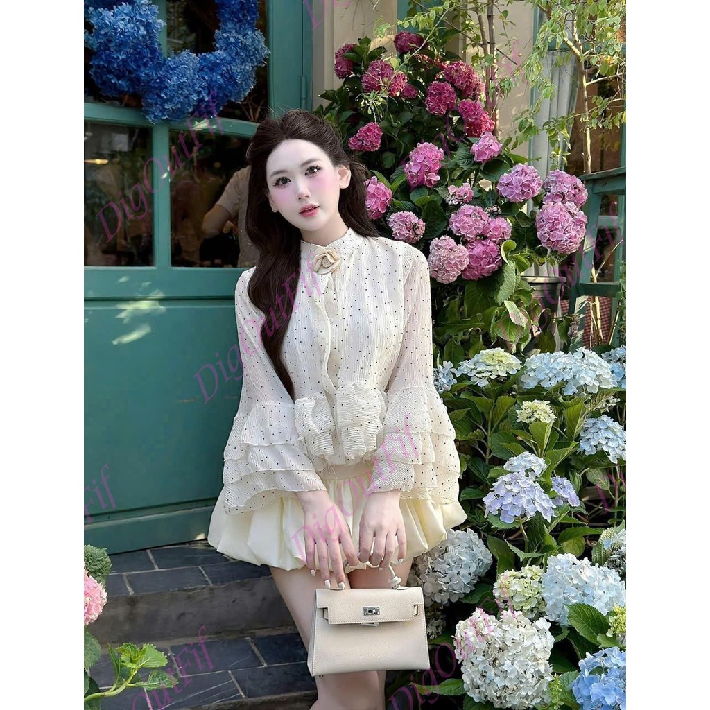 套裝 digoutf ht 長袖真絲雪紡襯衫圖案混搭短款真絲南瓜裙帶襯裡韓國時尚