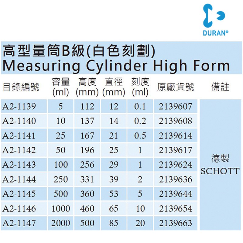 【DURAN】高型量筒B級 5ml-100ml 白色刻劃<蝦皮代開發票>