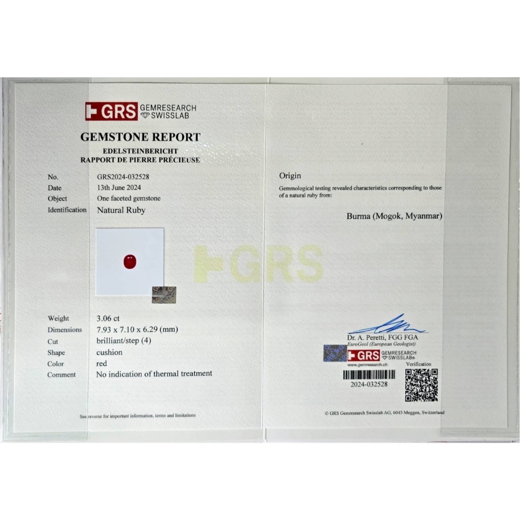 【台北周先生】緬甸莫谷Mogok無燒!天然紅寶石 3.06克拉 濃郁正紅色 送GRS證書