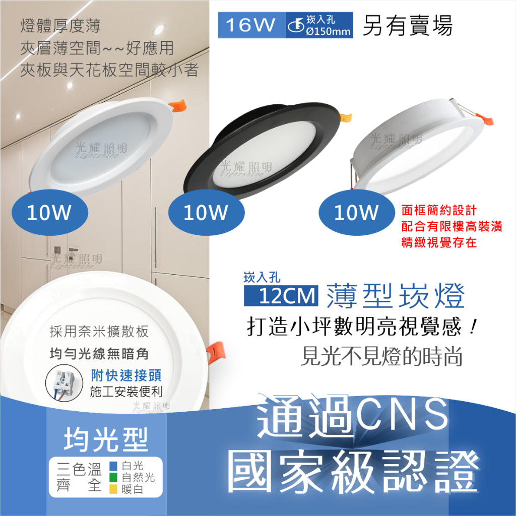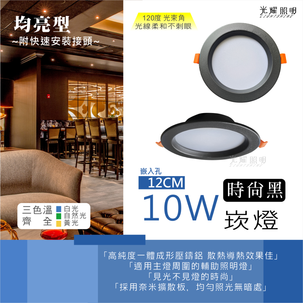 光耀照明 崁入式 12公分 10W 均光 柔光 崁燈 嵌燈 窄框 房間 客廳 樓梯間 轉角處 走廊 民宿 白殼 黑殼