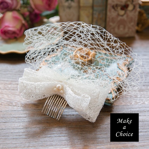 A170713【現貨】簡約珍珠白色網紗麻料蝴蝶結面紗髮梳髮飾。派對【白色、黑色】