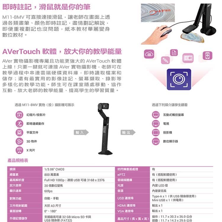 AVer M11-8MV 機械式手臂 USB 實物攝影機/投影機
