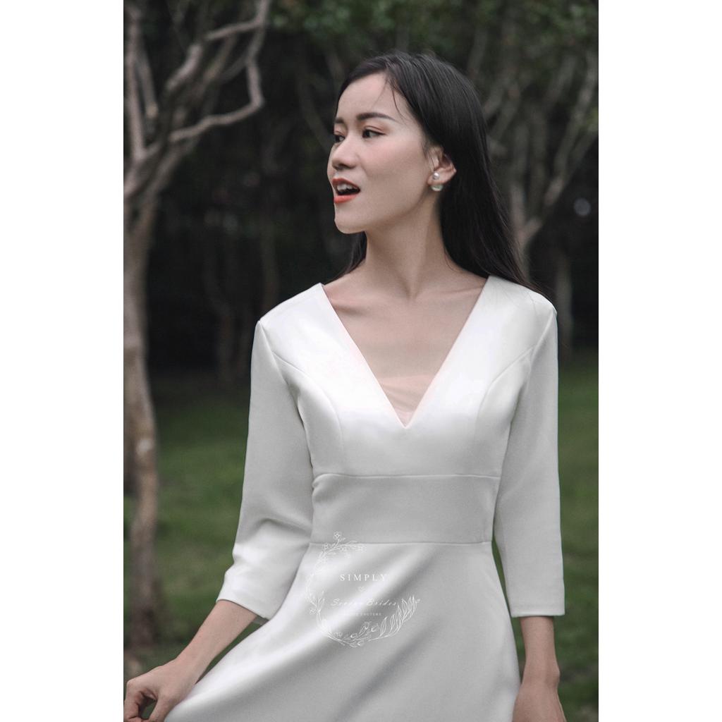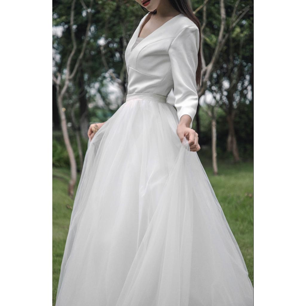 法式輕婚紗 新娘結婚白色婚紗 短款緞面中袖婚紗半裙兩件套 新娘領證禮服 旅拍婚紗照洋裝 森係出門紗 長款白色齊地婚紗