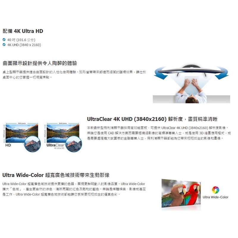 近全新 曲面 PHILIPS 飛利浦 40型4K VA螢幕 (BDM4037UW) ◎