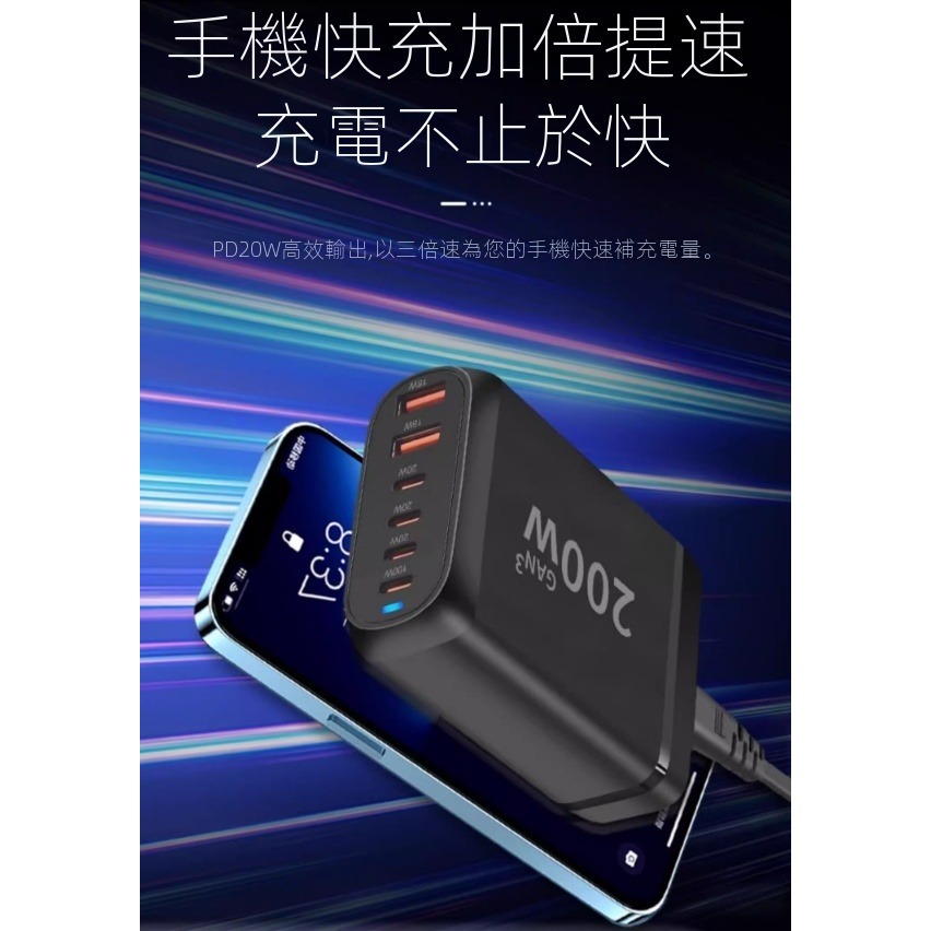 200W氮化鎵充電器 GAN充電器 4C2A快充頭 可充筆電 PD100W快充充電頭 iPAD充平板 旅行充 桌面充適配