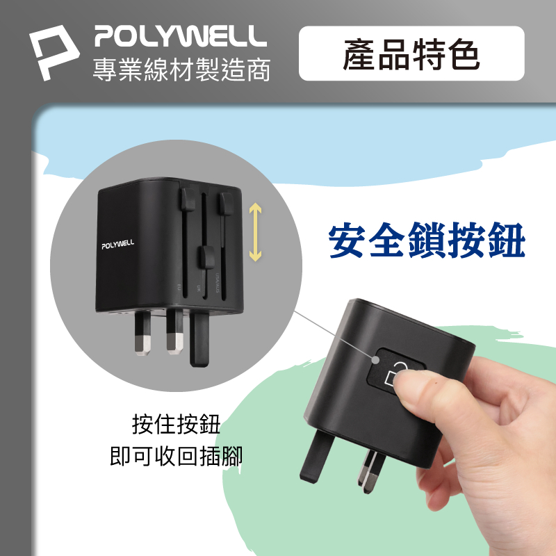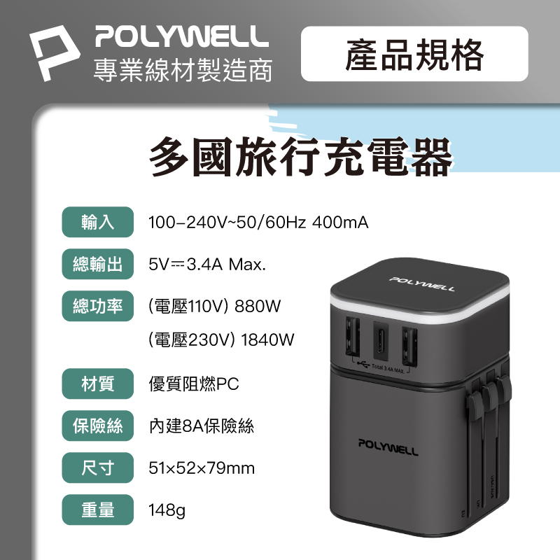 POLYWELL 多國旅行充電器 萬國轉接頭 二合一 Type-C+雙USB-A充電器 BSMI免驗 寶利威爾 台灣現貨
