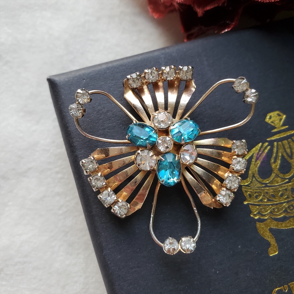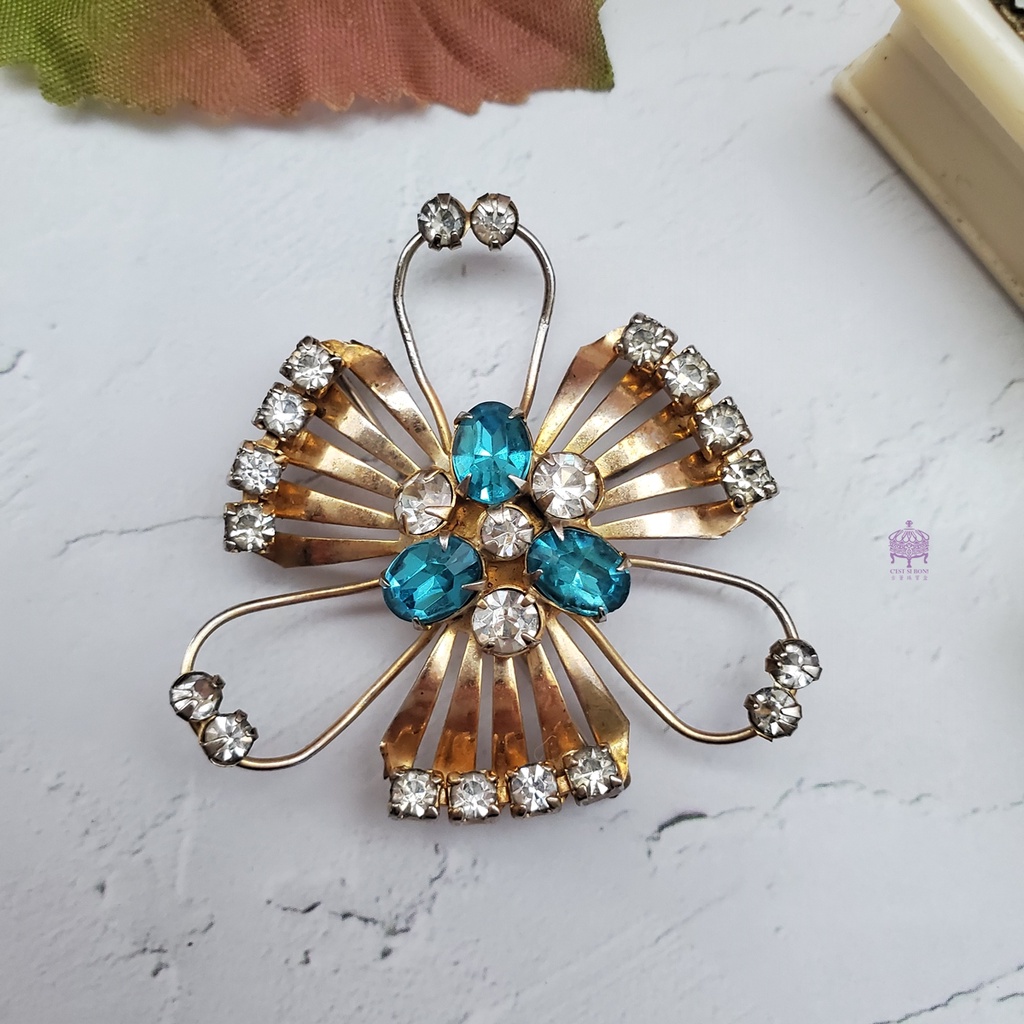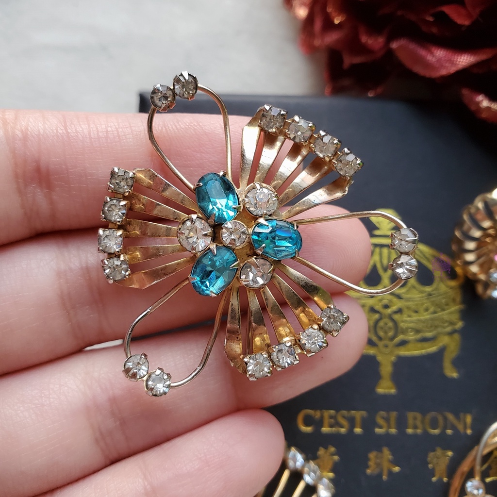 De Curtis水藍放射抽象花朵別針鍊墜【C’est Si Bon古董珠寶盒】Vintage老飾OL上班主播水鑽 優雅