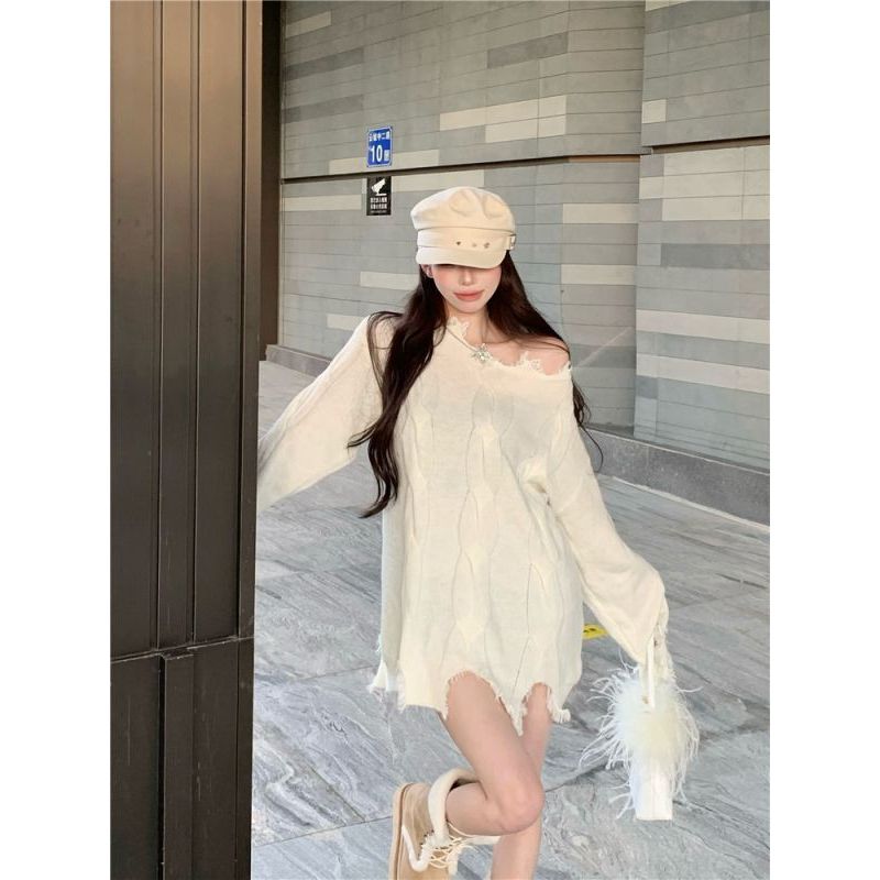 【HOT 本舖】實拍實價!慵懶風麻花毛衣女時髦寬鬆露肩下擺破洞設計感上衣潮