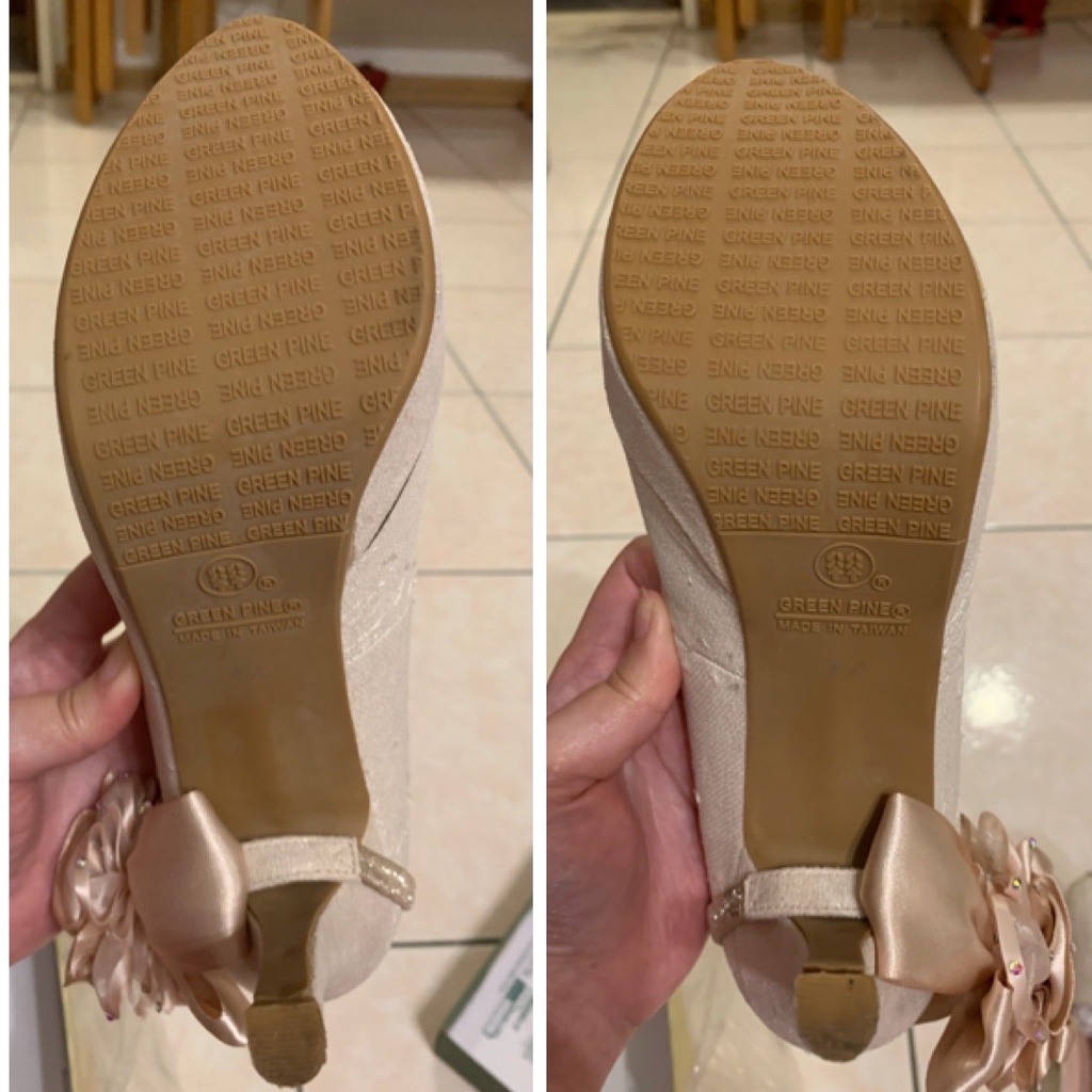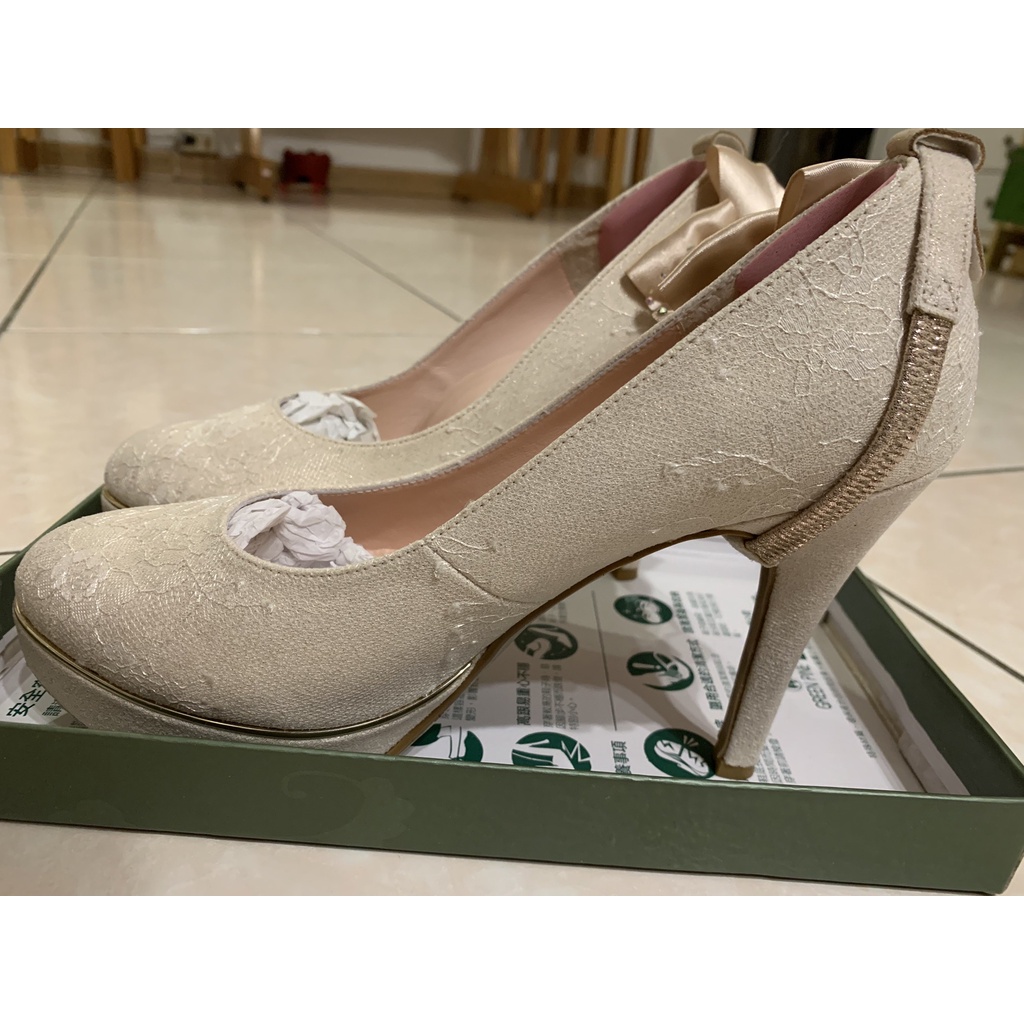 Green pine 蕾絲緞面水鑽可拆花朵高跟鞋 婚鞋 米白色 39